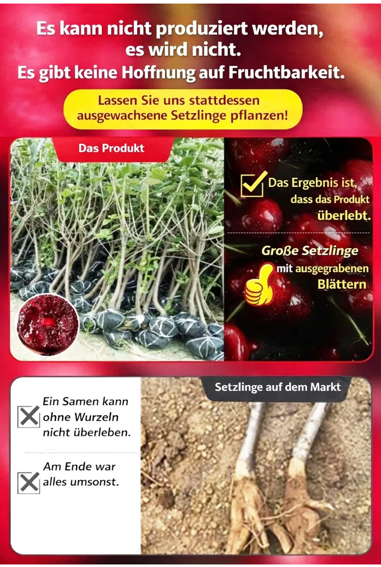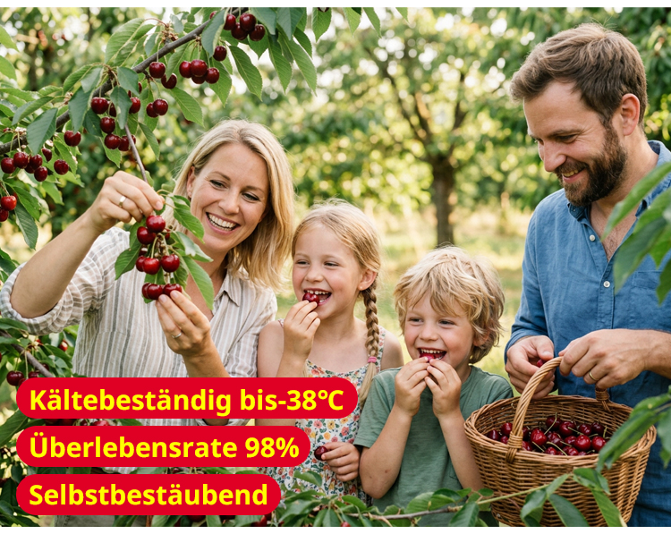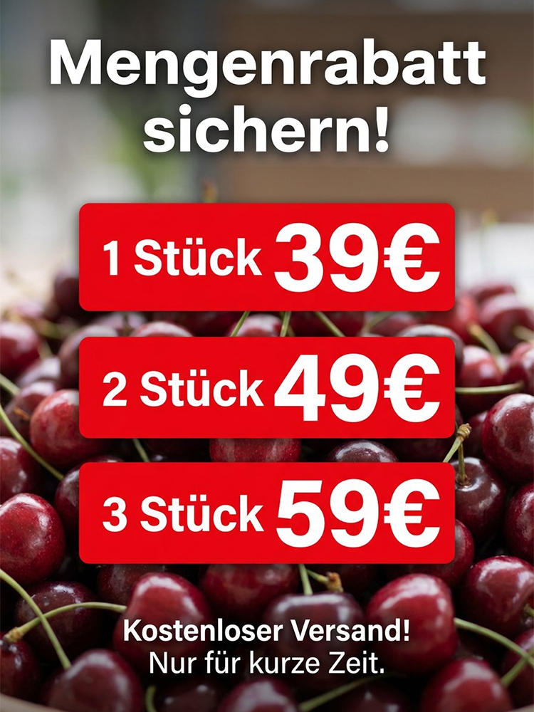 🍒 Kein langes Warten! Der veredelte Regina-Zwergkirschbaum liefert bis zu 45kg saftige Früchte/Jahr 🌳. Selbstbefruchtend, kompakt & winterhart bis -29°C ❄️. Perfekt für Garten & Kübel. Mit 100% Anwachsgarantie 🛡️ + Gratis-Anleitung. Jetzt pflanzen für schnelle Wurzeln! ⏳ Nur noch wenige Exemplare verfügbar – schnell sichern! 🏃‍♂️✨